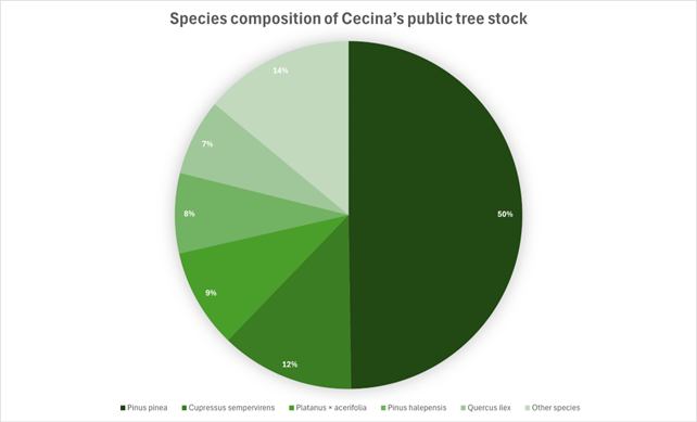 The inventory reveals a relatively rich tree stock, with several species represented across the urban area and a prevalence of taxa commonly found in Mediterranean urban green spaces. In particular, Pinus pinea alone represents almost 50% of the surveyed trees, while the five most common species (Pinus pinea, Cupressus sempervirens, Platanus × acerifolia, Pinus halepensis and Quercus ilex) together account for approximately 86% of the total population.